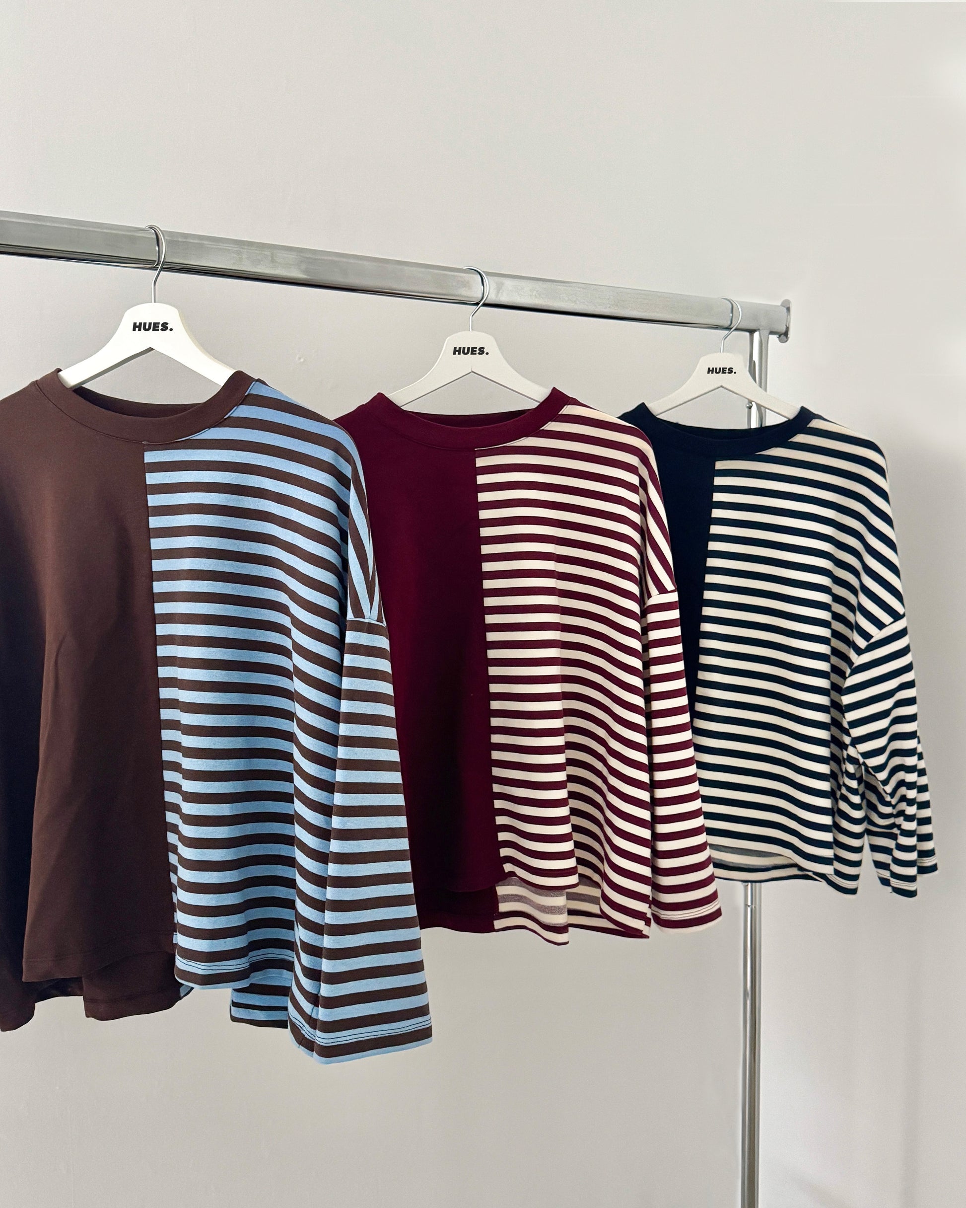 Longsleeve in soft 100% cotton with a relaxed fit. Features contrast double blue/brown stripes and a clean silhouette. Designed for everyday wear with a laid-back edge.