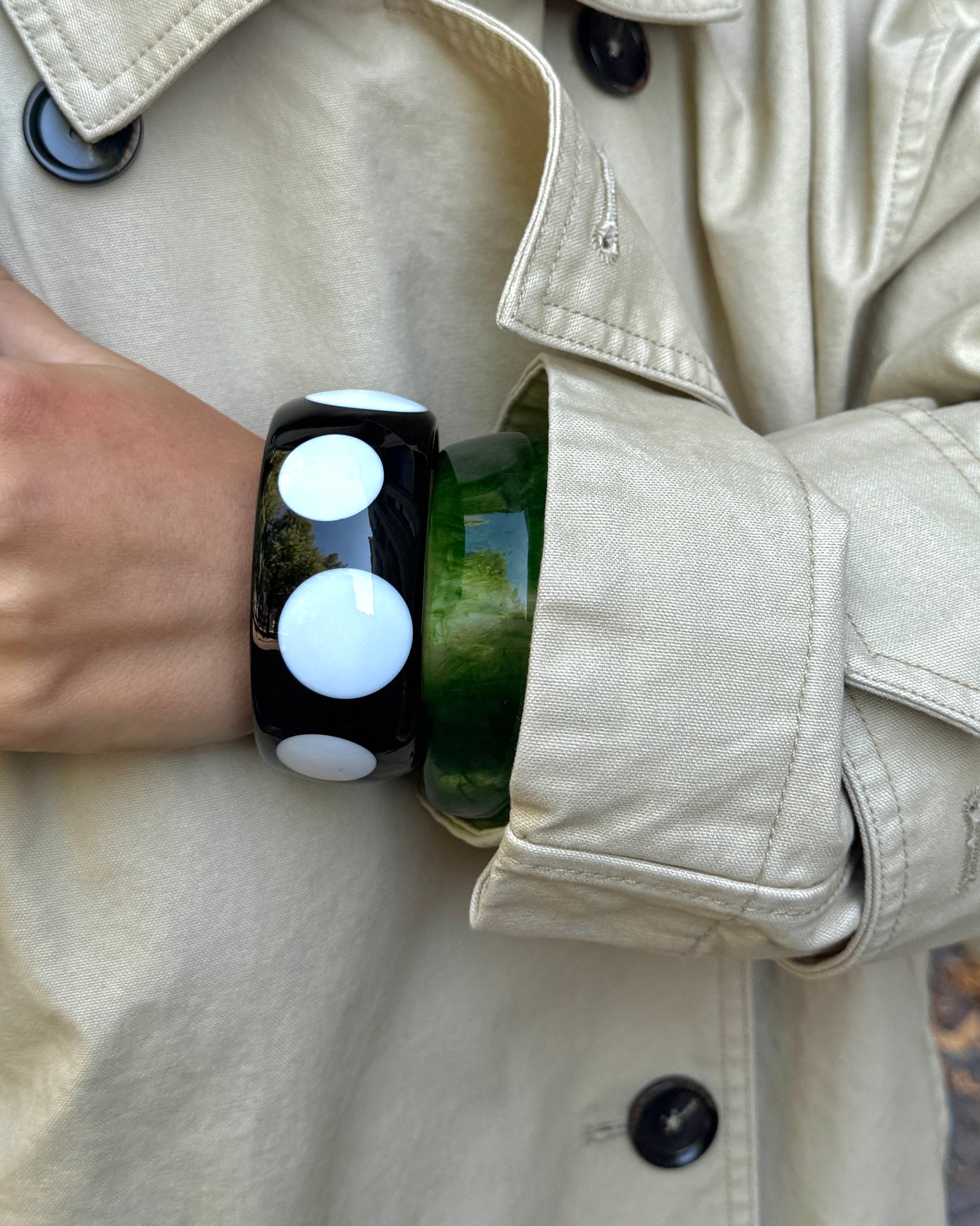 Sculptural bangle with a playful polka dot pattern. A bold yet minimal accessory made from lightweight resin with a smooth, glossy finish.
