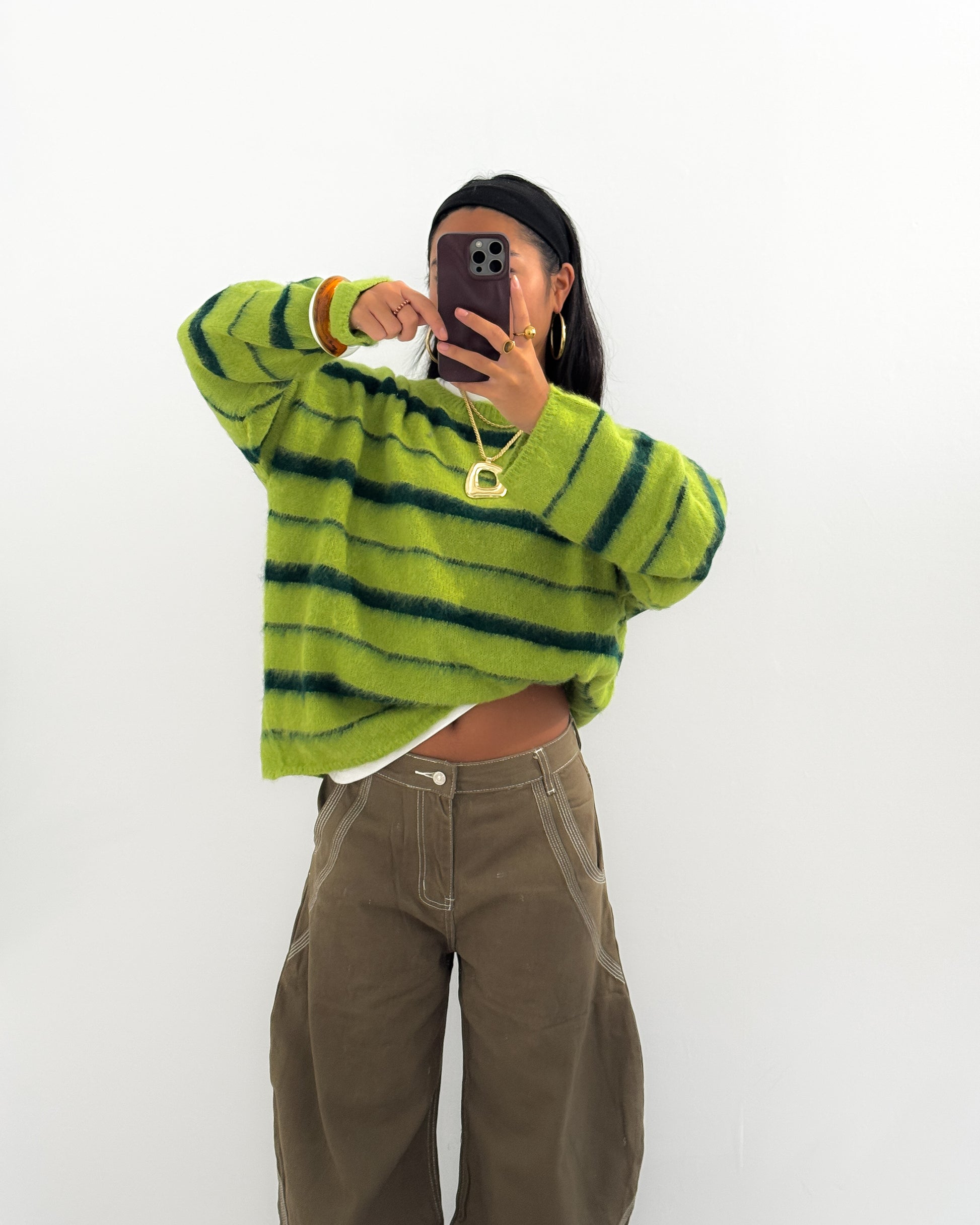 Relaxed knit crafted from a soft mohair blend. Defined by its green striped pattern and clean silhouette. Designed for a comfortable, effortless look.